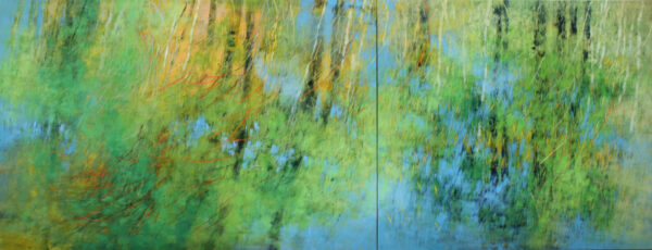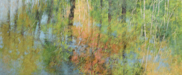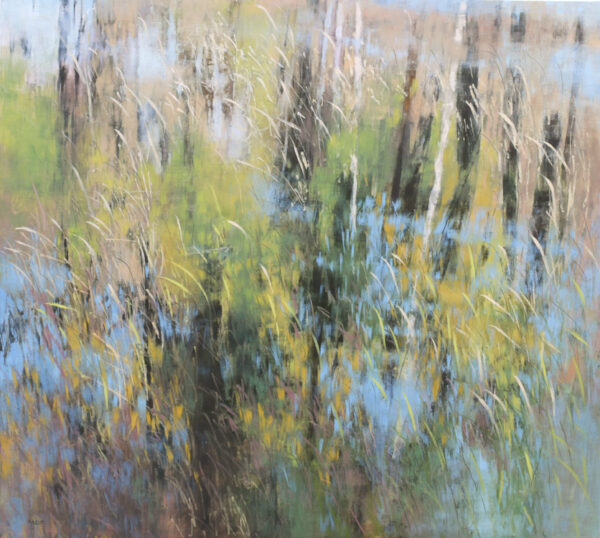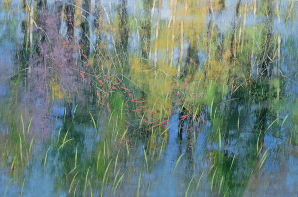 “Details built into patterns are at the core of each painting. Naturalistic detail forms the vocabulary (leaves, duckweed, stones, clouds, and sometimes frogs, fish, and birds) while juxtaposition determines the degree of abstraction or realism in each painting. The more closely I look, the more abstract the patterns become. Similarly, swirls of pollen and duckweed on a pond’s surface can feel abstract, even when the sun is casting clearly defined shadows across the surface, and the surrounding woods can be inferred in the leafy, dancing shapes in the shadows. I see realism and abstraction as points on the axis of proximity.”