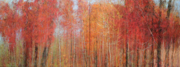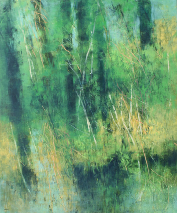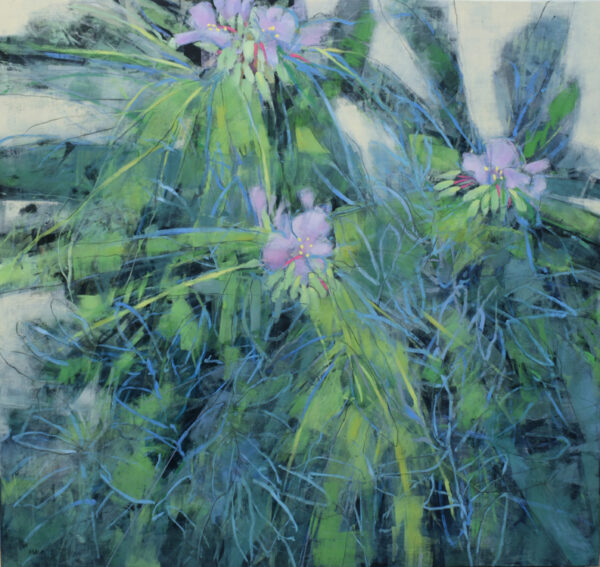 Ms. Malo’s most recent work focuses on elemental themes from nature – water in all its forms, air, granite, forests. And nearby gardens. Using photography to record her daily walks, Malo pieces together composite views of her favorite places, capturing the essence of each location. Sometimes the result is a “view” in its entirety, while at other times the paintings are more like a pieced quilt of close-up details recomposed into a more abstract memory painting. The paintings utilize techniques borrowed from her studies in printmaking, watercolor and oil painting.